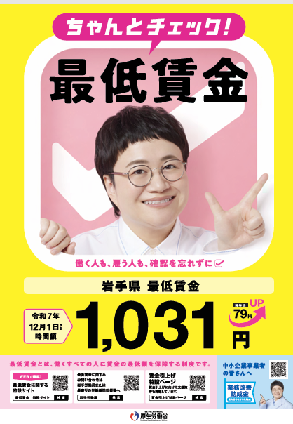岩手県最低賃金につきましては、時間額952円から1031に改正決定され、令和7年12月1日(月)に発効します。
