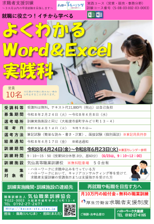 求職者支援訓練「よくわかるWord&Excel実践科」(2カ月)受講者募集!