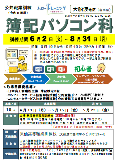 離職者を対象とした公共職業訓練の受講生を募集しております。